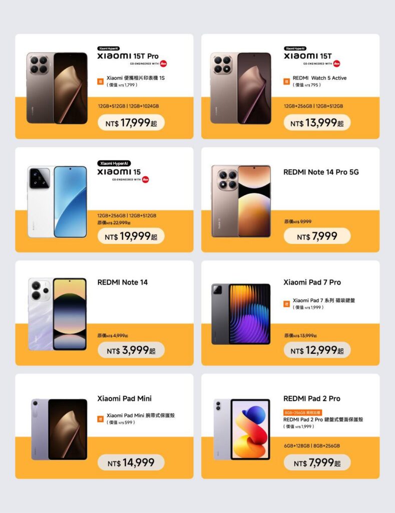 眾所矚目的 1111活動開跑囉~~~ 10/31 ~ 11/17 小米之家直營店獨家滿額贈!!! 單筆消費滿 $999 贈 Xiaomi 手機掛繩 ($399) 單筆消費滿 $9999 贈 Xiaomi 時尚雙肩包 ($1,299) 贈品數量有限送完為止。 =========== Xiaomi 15 優惠價 $19999起 (原價 $22999起) Xiaomi 15T Pro 售價 $17999起,(gift) 贈Xiaomi 便攜相片印表機 1S($1799) Xiaomi 15T 售價 $13999起,(gift) 贈REDMI Watch 5 Active($795) REDMI Note 14 Pro 5G 優惠價 $7999 (原價 $9999) REDMI Note 14 優惠價 $3999起 (原價 $4999起) 小米之家直營獨家優惠 憑小米商城會員 600積分可兌換手機折價券 $600 (滿八千使用) =========== 小米之家【台北西門町店暨維修中心】 營業時間: 12:00~22:00 維修中心:12:00-20:00 來台北有購嗨,消費歡樂抽 2025 西門 PLAY 樂購町 【潮流電色】