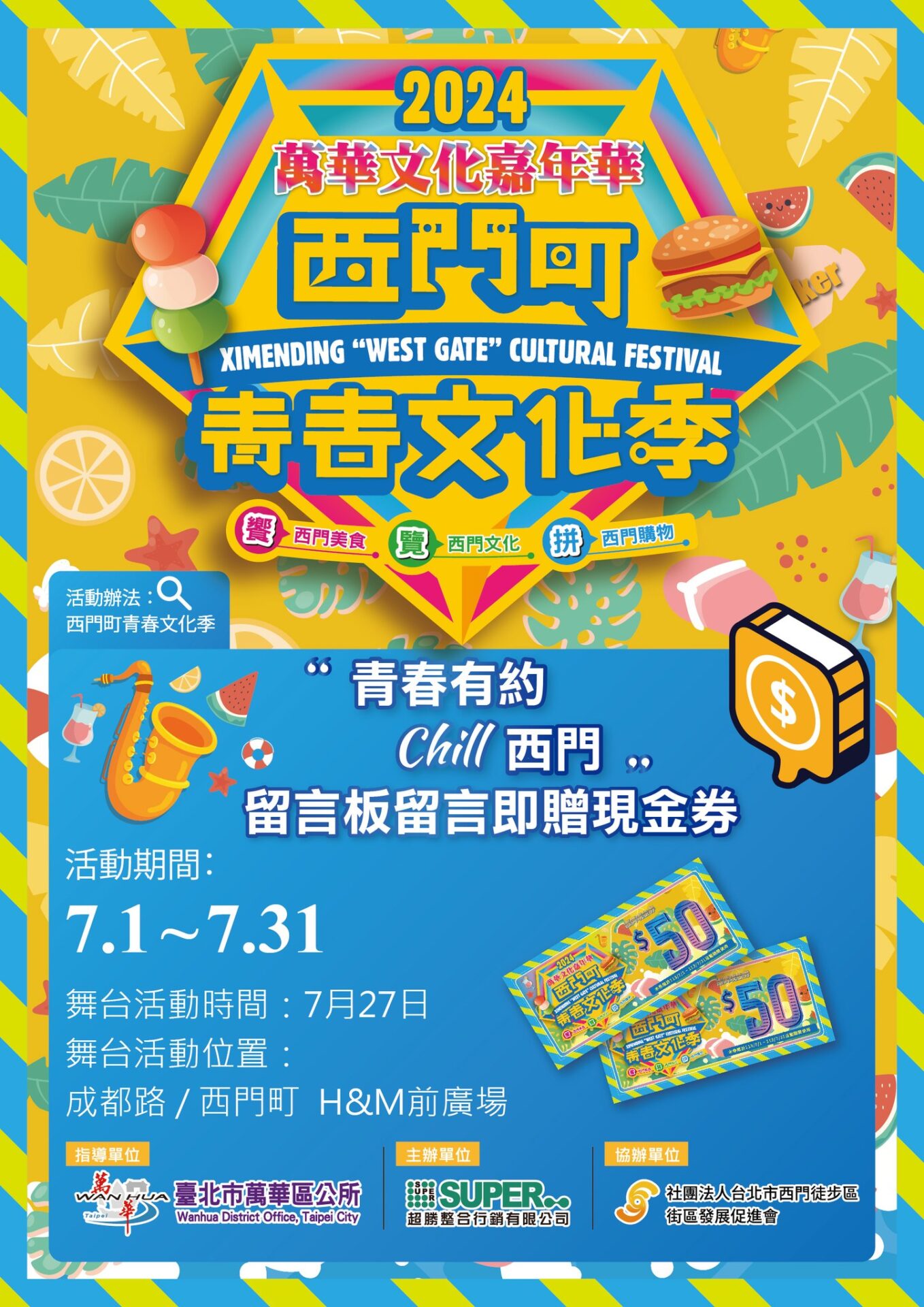 絕對不要錯過!西門町青春文化季又來了! 2024年7月1日至7月31日,西門町商圈再次掀起青春熱潮,為全民振興拚經濟! 只要在指定店家消費,出示振興優惠券,就能享受到超級划算的好康優惠! 趁著這個機會,一起來探索西門町的青春文化,感受這個充滿活力的商圈所帶來的魅力吧! 別忘了告訴你的朋友,7/27(六)還有熱血狂歡派對,讓大家一同加入我們吧! #萬華文化嘉年華 #西門町青春文化季 #狂歡派對 #西門町一起拚經濟 嚮辣 和牛麻辣鍋 台北捷運西門店 小米之家西門町店 再次開跑