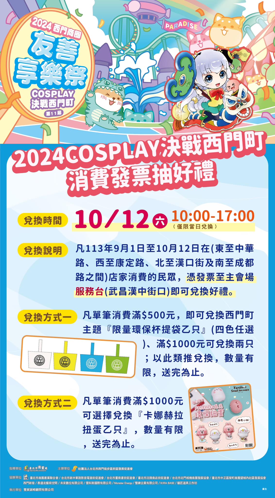 關於10/12 COSPLAY決戰西門町的活動 好多人問小編活動當天有蝦咪好康 只要113年9月1日至10月12日在西門町(東至中華路、西至康定路、北至漢口街及南至成都路之間)店家消費的民眾,出示發票至主會場服務台(武昌漢中街口)即可兌換好康: 兌換方式一:凡單筆消費滿500元即可兌換西門町主題限量環保杯提袋一只(四色任選)、滿1000元可兌換兩只;以此類推兌換,數量有限,送完為止。 兌換方式二:凡單筆消費滿1000元可選擇兌換卡娜赫拉扭蛋一只,數量有限,送完為止。 相同發票,環保杯提袋與扭蛋僅可擇一兌換 兌換時間;10/12 AM10:00-PM17:00 當天除了精彩的賽事之外 最夯、最可愛的廢柴也會一同出席 歡迎大家來現場與最可愛的廢柴拍照 柴語錄 Shiba Says #Cosplay #西門町 #Cosplay決戰西門町 #2024第11屆Cosplay決戰西門町 #Cosplay遊行 膳魔師西門紅樓快閃店 西門商圈奇遇夜